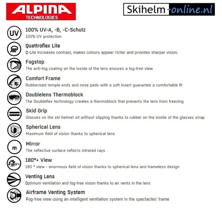 Zowel skiërs als snowboarders die een voorliefde hebben voor een moderne, cool uitziende design skibril met 'spiegelglas' komen regelmatig uit bij deze mooie Alpina Bivio goggle. Technisch vernuft, een hoog comfort en de spiegelende lens maken de Alpina Bivio een zeer prettig model... De bril is voorzien van tweevoudige foamlaag (hypo-allergeen) waarmee de bril comfortabel aansluit op uw gezicht maar ook het onbreekbare lensmateriaal en de ventilerende, dubbele lens met Anti-Fog coating zijn zomaar een paar positieve eigenschappen. Dit laatste voorkomt dat de bril kan bevriezen en een beslagen lens is bij dit model zelfs nauwelijks mogelijk. De antislip elastiekband is eenvoudig verstelbaar en de fijne, groen getinte spiegel-lens geeft 100% bescherming tegen schadelijk licht. Daarnaast reflecteert de spiegelcoating infraroodstraling waardoor de belasting van de ogen wordt verminderd.
