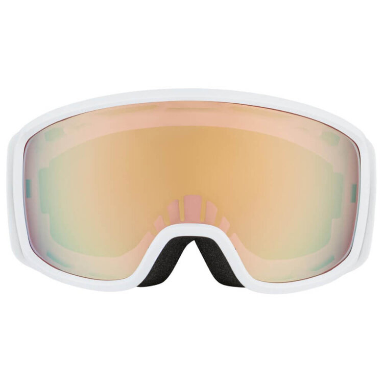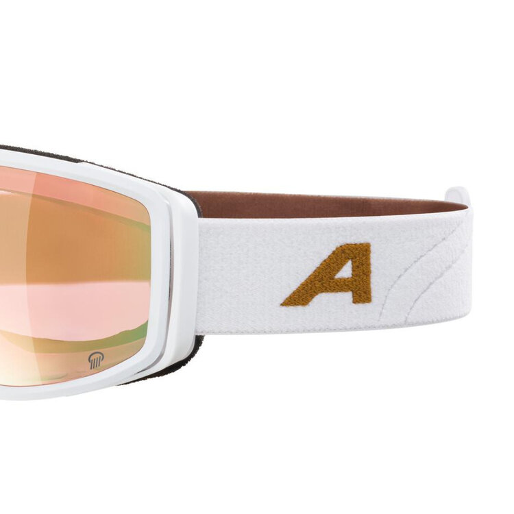 De lens van de skibril is erg bepalend voor de prijsstelling. Deze witte Alpina Bivio heeft een polarized gecoate, spiegelende Quattroflex lens. Technisch geavanceerd want hij combineert namelijk een mooie gouden tint met polariserende en contrast verhogende eigenschappen. Er is door de spiegelcoating maximale filtering van hinderlijke schitteringen wat een goed, contrastrijk, helder zicht oplevert. Deze bril beschermt bij elk weertype maar geeft ideaal zicht bij wat bewolkt weer tot licht zonnig weer (categorie 2). Geschikt voor alle soorten wintersport en dankzij de spiegelcoating wordt infrarood gereflecteerd wat rustiger is voor de ogen.