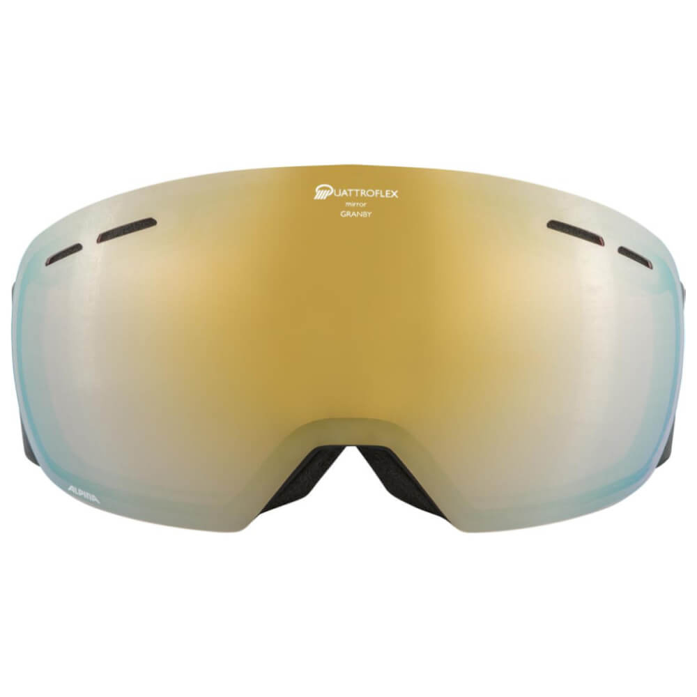De lens van de skibril is erg bepalend voor de prijsstelling. Deze zwarte Alpina Granby heeft een polarized gecoate, spiegelende Quattroflex lens. Technisch geavanceerd want hij combineert namelijk een mooie gouden tint met polariserende en contrast verhogende eigenschappen. Er is door de spiegelcoating maximale filtering van hinderlijke schitteringen wat een goed, contrastrijk, helder zicht oplevert. Deze bril beschermt bij elk weertype maar geeft ideaal zicht bij wat bewolkt weer tot licht zonnig weer (categorie 2). Geschikt voor alle soorten wintersport en dankzij de spiegelcoating wordt infrarood gereflecteerd wat rustiger is voor de ogen.