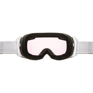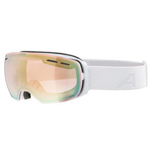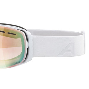 Een wat groter model, 'frameless design' skibril voorzien van hoge specificaties, dat is deze witte Alpina Granby skibril met witte band en spiegelende, photochromic, polariserende Quattro Varioflex Gold lens. Hoogwaardige techniek, een extreem breed zicht, 100% UV en Infra-rood blok, een prima ventilatie en goede verstelbaarheid.