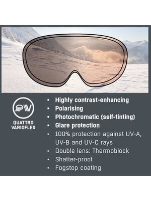 Deze Alpina Nendaz heeft één van de meest luxe lenzen die een skibril kan hebben: de Quattro Varioflex lens van Alpina. Hij kleurt mee met de hoeveelheid zonlicht in de directe omgeving. Als de zon gaat schijnen, wordt de lens binnen enkele seconden donkerder en als de zon verdwijnt achter de wolken, kleurt hij lichter. Zo heb je dus altijd optimaal zicht zonder zelf lenzen te moeten wisselen! Daarnaast is de lens ook polariserend gecoat zodat alle schitteringen en reflecties worden weg gefilterd. De lens combineert dus de voordelen van het mee-kleuren met een maximale filtering voor een goed, contrastrijk, helder zicht. Optimaal is het zicht bij bewolkt tot licht zonnig weer (categorie 2 en 3) maar beschermt de bril 100% tegen schadelijk UV in alle weersomstandigheden. Geschikt voor alle soorten wintersport, ideaal voor wisselende lichtomstandigheden.