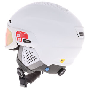 Deze witte Alpina Oro QV is eigenlijk de completere uitvoering van de Alto voorzien van het MIPS veiligheidsysteem en het meest luxe, meekleurende vizier. Deze stevige, zeer comfortabele skihelm heeft de veilige Hardshell / ABS constructie. Uniek aan deze modellen is het TRM mechanisme dat het vizier naadloos laat aansluiten op de helm. Hierdoor is er geen hinderlijke luchtstroom die je bij veel andere vizier-skihelmen wel hebt. Het luxe Photochromic (meekleurende) vizier is breed en geeft daardoor maximaal zicht en het comfort is erg fijn door de pasvorm maar ook door de met Lavalan schapenwol afgewerkte nekwarmer en binnenstoffering. De hygiëne is goed voor elkaar dankzij het feit dat deze uitneembaar is. De ventilatie is de helm zorgt voor minder vocht in de helm waardoor het dubbelwandige vizier nagenoeg niet kan beslaan. Ook bij warm weer is het zweten aanzienlijk minder wat het comfort nog beter maakt.