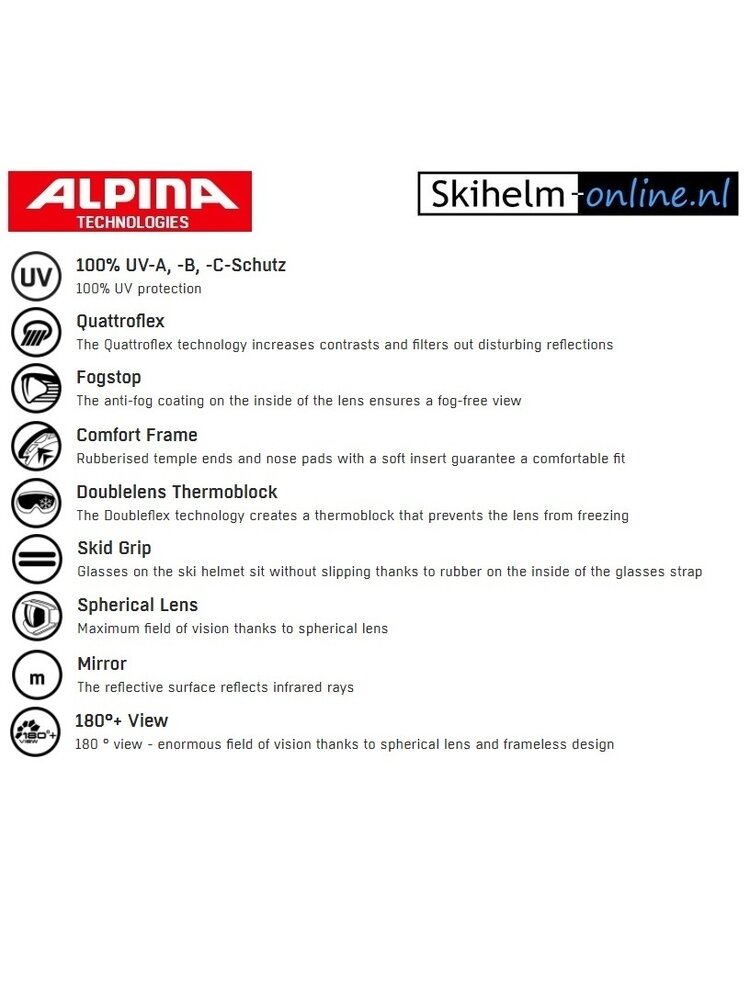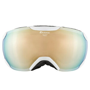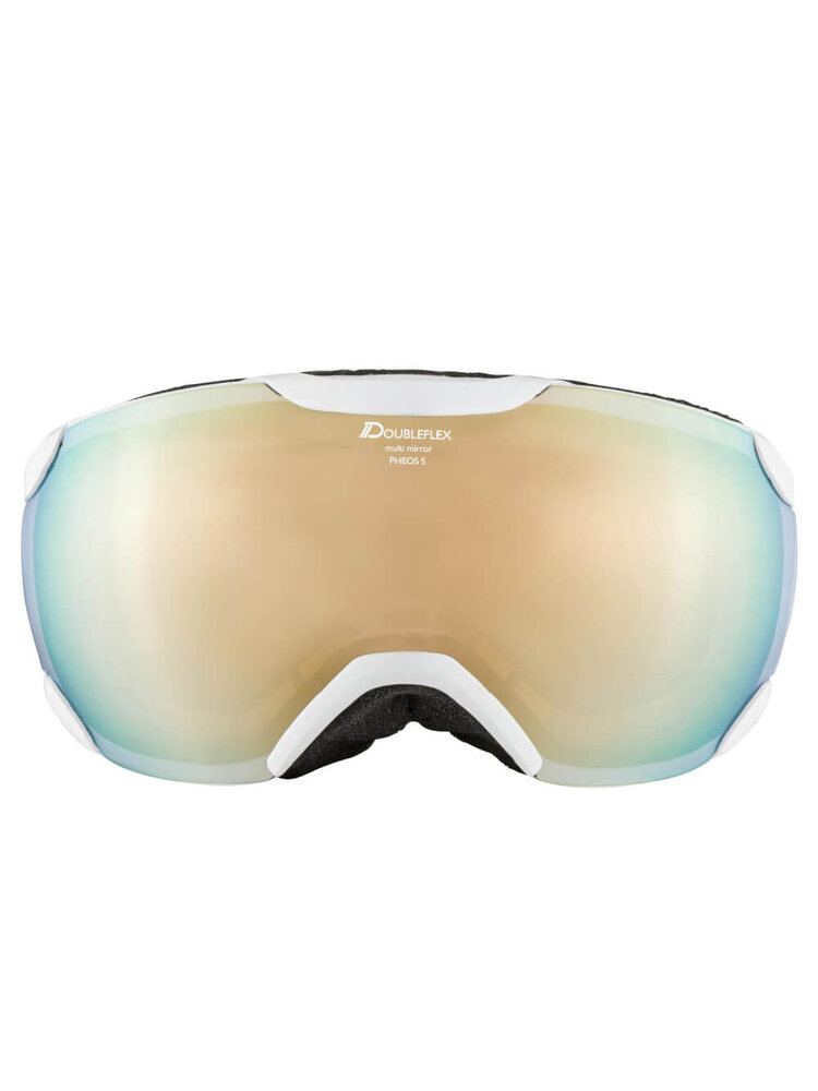 De lens van de skibril is erg bepalend voor de prijsstelling. Deze Alpina Pheos Q-Lite versie met wit frame en licht oranje, spiegelende QuattroFlex Lite Mirror lens is technisch geavanceerd. Hij heeft een frisse goudkleurige tint en is voorzien van anti-fog coating waardoor de lens niet gaat beslaan. Deze bril beschermt bij elk weertype maar geeft ideaal zicht bij wat donkerder, bewolkt weer en sneeuw (categorie 2). Geschikt voor alle soorten wintersport en 100% Infrarood reflectie dus rustiger voor de ogen dankzij de spiegelcoating.