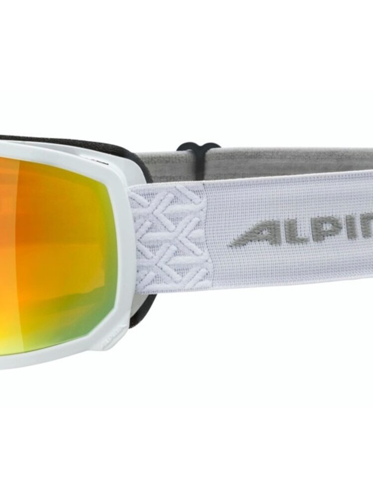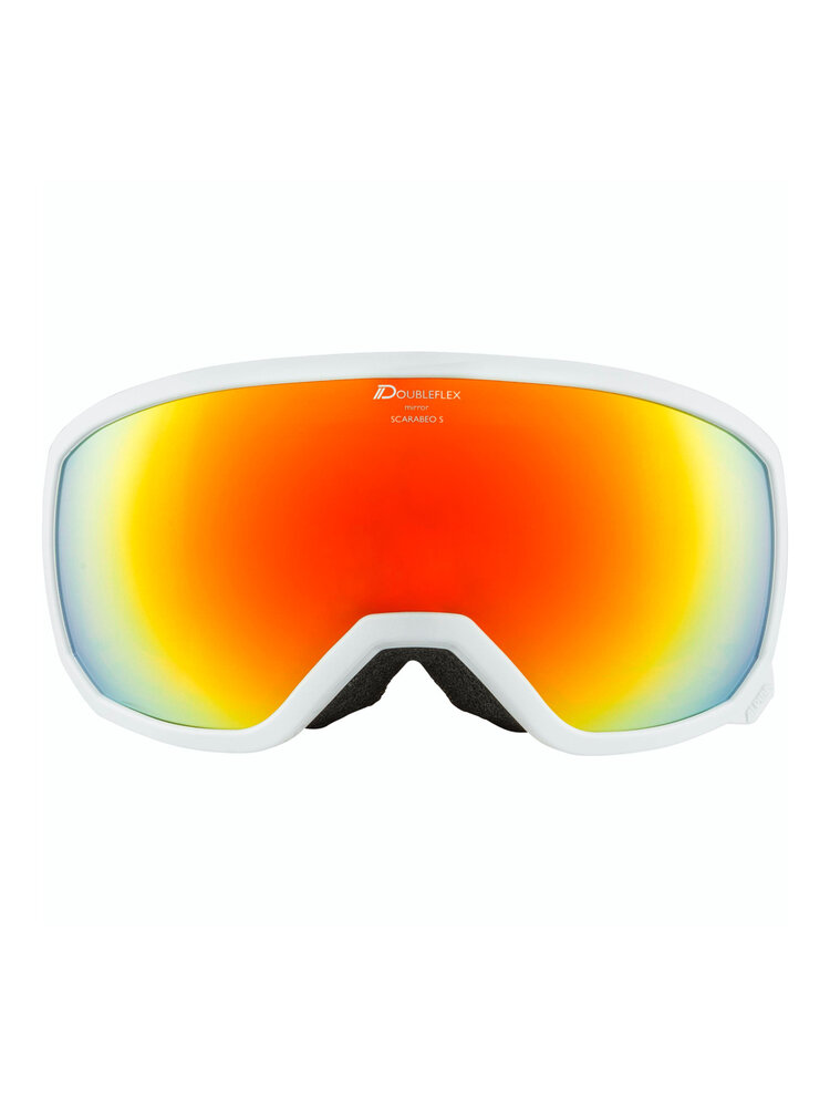 Deze witte Alpina Scarabeo Q-Lite OTG skibril is er in diverse uitvoeringen. Deze heeft de fijne QuatroFlex Light Red Mirror lens met rode tint waardoor een zeer contrastrijk beeld ontstaat. De Fogstop-coating aan de binnenzijde voorkomt dat de lens beslaat waarbij door de Airframe Venting techniek de ventilatie prima op orde is. Bovendien is de dubbele lens breukvast, 100% UV-bescherming en kan hij niet bevriezen. Het flexibele comfortframe en de een twee-laags foamlaag waarmee de bril het gezicht raakt, zorgen voor veel draagcomfort. Siliconen stroken op de band van de goggle garanderen in combinatie met een skihelm en dat hij goed blijft zitten. De sferische Scarabeo S. goggle is een Small-Medium Size (S40) bril met OTG voorziening dus kan hij over uw normale bril worden gedragen.