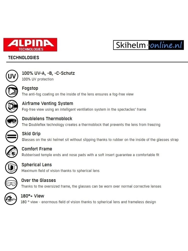 Alpina heeft in deze Scarabeo OTG skibril de sferisch gevormde Red Mirror spiegellens: een rood gekleurde lens die UV én Infrarood straling blokt en dus goed beschermt. Het getinte zicht brengt meer contrast en deze categorie 2 (S2) lens is dan ook optimaal bij bewolkt en wisselvallig weer. De lens is niet meekleurend dus is hij minder geschikt voor (erg) zonnig weer. Wél zorgt de spiegelcoating voor perfecte reflectie van Infra Rood straling dus rustig voor de ogen.