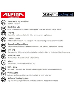 Zowel skiërs als snowboarders die een voorliefde hebben voor een moderne, cool uitziende design skibril met 'spiegelglas' komen regelmatig uit bij deze mooie Alpina Taos Q-Lite goggles. Technisch vernuft, een hoog comfort en de spiegelende lens maken de Alpina Taos een zeer prettig model... De bril is voorzien van tweevoudige foamlaag (hypo-allergeen) waarmee de bril comfortabel aansluit op uw gezicht maar ook het onbreekbare lensmateriaal en de ventilerende, dubbele lens met Anti-Fog coating zijn zomaar een paar positieve eigenschappen. Dit laatste voorkomt dat de bril kan bevriezen en een beslagen lens is bij dit model zelfs nauwelijks mogelijk. De antislip elastiekband is eenvoudig verstelbaar en de fijne, groen getinte spiegel-lens geeft 100% bescherming tegen schadelijk licht. Daarnaast reflecteert de spiegelcoating infraroodstraling waardoor de belasting van de ogen wordt verminderd.