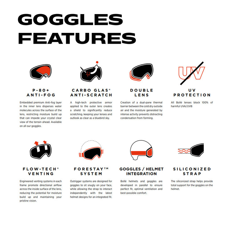 Deze Bollé Bedrock Plus skibril met Bronze Blue lens is heeft een medium maat. Deze hele serie skibrillen heeft dubbelwandige lenzen en de Bollé Flow-Tech ventilatie die er samen met de Anti-fog coating voor zorgen dat het 'glas' niet bevriest of beslaat. De lens is daarbij gemaakt van Anti-scratch afgewerkt Carbo-glas (Polycarbonaat). Handig zijn de siliconen strips op de verstelbare band die ervoor zorgen dat de bril niet van uw hoofd of helm afschuift. Het flexibele comfortframe en de prettig en zacht aanvoelende, dubbele foamlaag (antibacterieel) waarmee de bril het gezicht raakt, zorgen voor een zeer prettig draagcomfort.