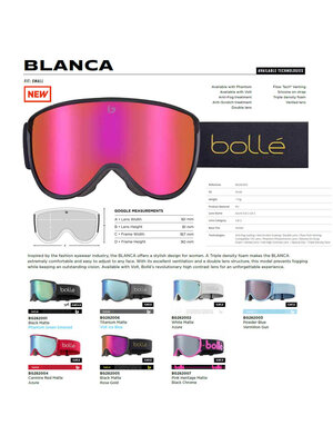 In deze uitvoering is de Bollé Blanca skibril voorzien van een donkere Black Chrome Mirrorlens met Amber-kleurige tint die het zicht rustig en contrastrijk maken. Deze uitvoering is gemaakt om het best te presteren bij licht bewolkt tot lekker zonnig weer (categorie 3). De bescherming is prima want schadelijk UV licht en Infrarood straling wordt 100% geblokt. Ook dit Bollé model is verkrijgbaar in verschillende prijsklassen doordat hij verkrijgbaar is met verschillende soorten lenzen. U kunt zelf kiezen welke uitvoering met welke lens het best bast bij uw specifieke wensen en budget.