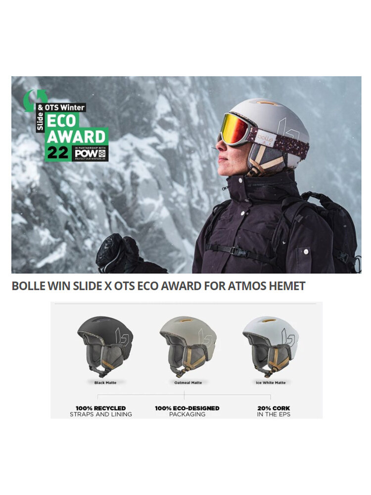 Dit baanbrekende model is grotendeels recyclebaar en onderstreept de lange termijn visie van Bollé als duurzame fabrikant. Deze Eco Atmos geeft met de onderstaande specificaties antwoord op de behoeften van fervente skiërs die hun steentje willen bijdragen aan behoud van onze planeet.