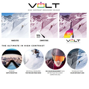 Deze uitvoering van de grote, torisch gebogen Bollé Eco Torus skibril heeft een donkere Volt Ice Blue categorie 3 spiegellens. De Volt techniek zorgt voor 30% meer contrast en geeft een rustig, grijs getint beeld met optimaal zicht bij bewolkte tot licht zonnige omstandigheden. De bescherming is prima want schadelijk UV licht en Infrarood straling wordt 100% geblokt. Ook dit Bollé model is verkrijgbaar in verschillende prijsklassen doordat hij verkrijgbaar is met verschillende soorten lenzen. U kunt zelf kiezen welke uitvoering met welke lens het best bast bij uw specifieke eisen.