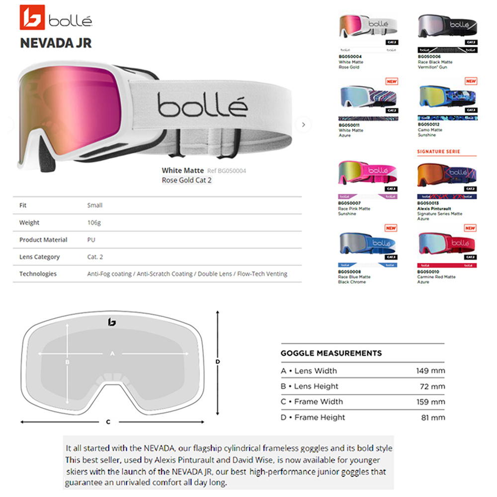 Deze uitvoering van de Bollé Nevada JR. skibril heeft een categorie 2 lens die een roodachtige tint heeft en het beste zicht geeft bij bewolkte en licht zonnige omstandigheden. De bescherming is prima want schadelijk UV licht wordt 100% geblokt. Ook dit Bollé model is verkrijgbaar in verschillende prijsklassen doordat hij verkrijgbaar is met verschillende soorten lenzen. U kunt zelf kiezen welke uitvoering met welke lens het best bast bij uw specifieke eisen.
