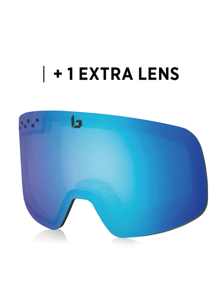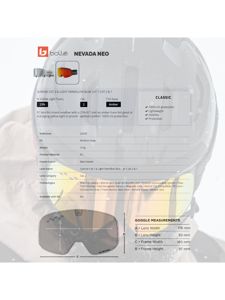 Deze uitvoering van de Bollé Nevada skibril wordt geleverd met twee hoogwaardige lenzen: de meest geavanceerde is Bollé's Sunrise lens die met heldere tint meer contrast en diepte toevoegt bij (licht) zonnig weer (Cat. 2). De meegeleverde tweede lens is een categorie 1 lens, bedoeld voor donker bewolkt, sneeuwig weer. Beide lenzen beschermen tegen schadelijk UV waarbij de Sunrise lens door zijn spiegelcoating ook Infrarode straling blokt.