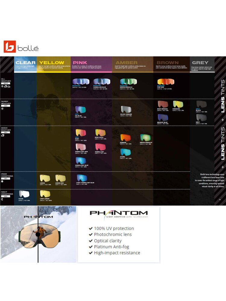 Deze uitvoering van de Bollé Nevada skibril wordt geleverd met Photochromic lens: de Phantom Fire Red lens die meekleurt aan de hand van de hoeveelheid (zon)licht. Dit maakt de bril nagenoeg geschikt voor ieder weertype. De bescherming is prima want schadelijk UV licht en Infrarood straling wordt 100% geblokt. Ook dit Bollé model is verkrijgbaar in verschillende prijsklassen doordat hij verkrijgbaar is met verschillende soorten lenzen. U kunt zelf kiezen welke uitvoering met welke lens het best bast bij uw specifieke eisen en uw beschikbare budget.