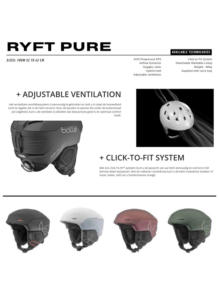 Deze stoer vormgegeven Bollé Ryft Pure wintersporthelm biedt een hoge bescherming bij impact en heeft een hele behoorlijke schokabsorptie. Bollé heeft met het Click-to-fit Systeem in deze helm een fijn verstel-mechaniek dat zich qua maatvoering precies aanpast aan uw hoofd-omtrek. Dit zorgt voor een optimale pasvorm en daardoor meer comfort. De ventilatie is actief en instelbaar dankzij de Airflow Extractor en de ergonomisch gevormde 3D-oorkussens zijn afneembaar en uitwasbaar, perfecte hygiëne is hierdoor gegarandeerd. Door het ontwerp van de Earpads mist u niets aan omgevingsgeluid maar bieden ze wel warmte en comfort.