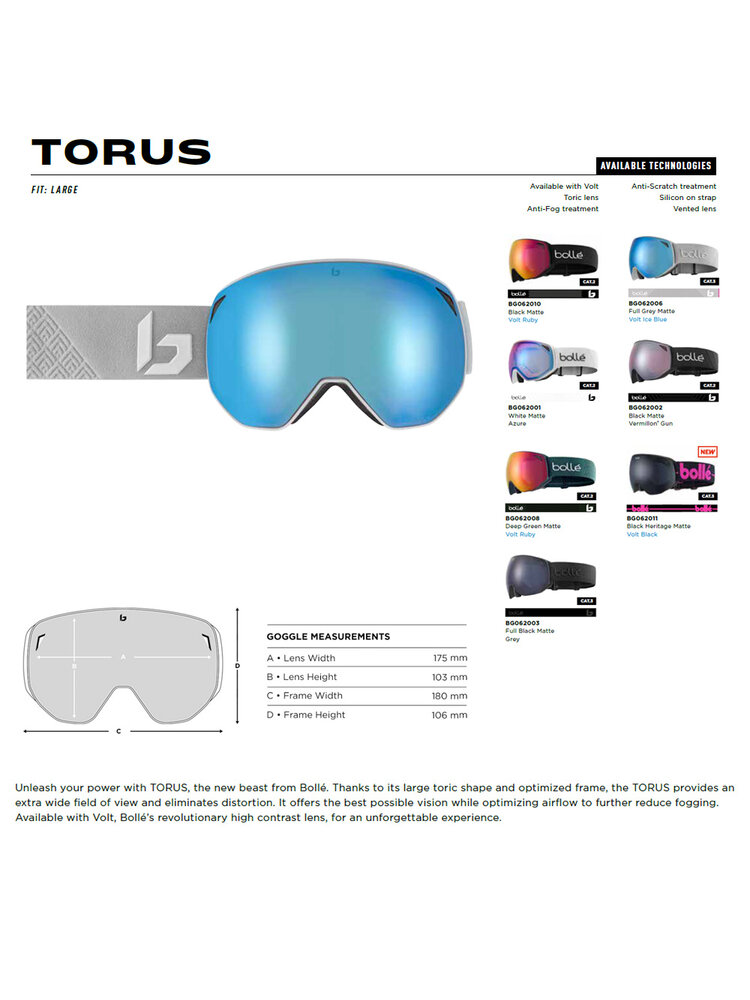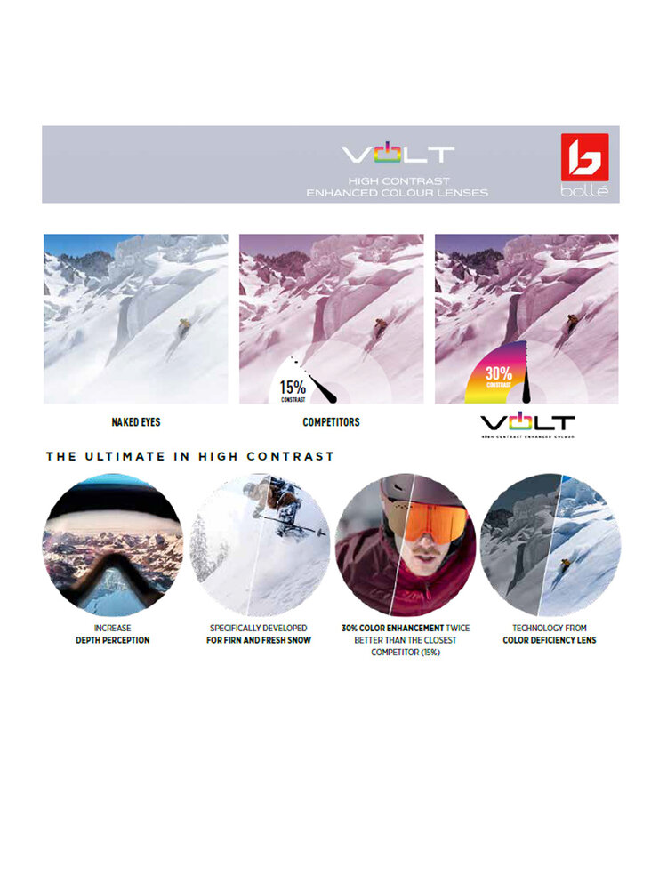 Deze uitvoering van de grote, torisch gebogen Bollé Torus skibril heeft een donkere Volt Ruby Mirror categorie 2 spiegellens. De Volt techniek zorgt voor 30% meer contrast en geeft een rustig, grijs getint beeld met optimaal zicht bij bewolkte tot licht zonnige omstandigheden. De bescherming is prima want schadelijk UV licht en Infrarood straling wordt 100% geblokt. Ook dit Bollé model is verkrijgbaar in verschillende prijsklassen doordat hij verkrijgbaar is met verschillende soorten lenzen. U kunt zelf kiezen welke uitvoering met welke lens het best bast bij uw specifieke eisen.