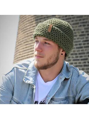 Deze leger-groene Newyste Style Q-1301 beanie met hoge, opstaande rand is een grof gehaakte, wollen muts die lekker warm is en zeer comfortabel aanvoelt, des te meer door de fleeceband die erin is verwerkt. De uitstraling is stoer en tijdloos.