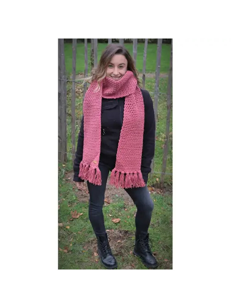 Deze grof gehaakte sjaal / scarf is uitgevoerd in roze Acrylwol. Dat materiaal is super warm en voelt zeer comfortabel. De uitstraling is stoer en tijdloos.