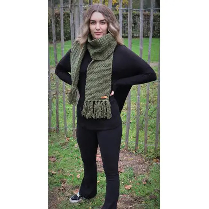 Deze grof gehaakte sjaal / scarf is uitgevoerd in groene Acrylwol. Dat materiaal is super warm en voelt zeer comfortabel. De uitstraling is stoer en tijdloos.