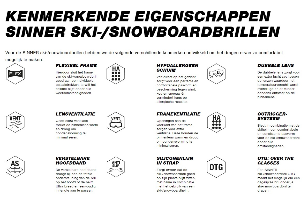 Hij is super lichtgewicht, behoorlijk geventileerd, en heeft een hele fijne spiegellens die Anti-fog gecoat is. Deze Sinner Arc Trans+ sneeuwbril is erg compleet en zeer comfortabel. Door de dubbelwandige lens beslaat hij niet en de 3-laags hypo-allergeen foamrand sluit hij nauwkeurig en comfortabel aan op het gezicht. De elastiek-band is net als alle andere Sinner skibrillen voorzien van antislip siliconen-strepen zodat hij niet schuift op skihelm of hoofd. Ook is hij gemakkelijk naar de juiste lengte te verstellen, ook met handschoenen aan.