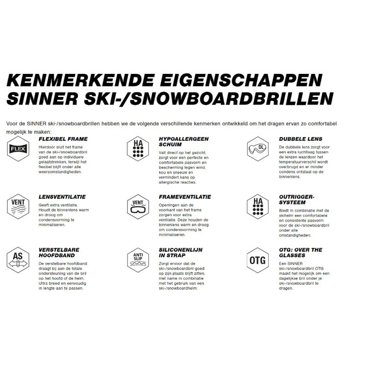 Naast een fijn draagcomfort, heeft deze Sinner Avon skibril een anti-condens laag en een frame-ventilatiesysteem. Daardoor wordt voorkomen dat de bril aan de binnenkant van de lens beslaat. Ook is deze bril makkelijk verstelbaar, wordt er gebruik gemaakt van een anti-slipprint en een beweegbaar outrigger-systeem. Daardoor past deze bril perfect onder een helm!