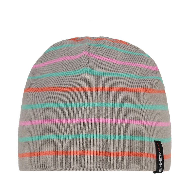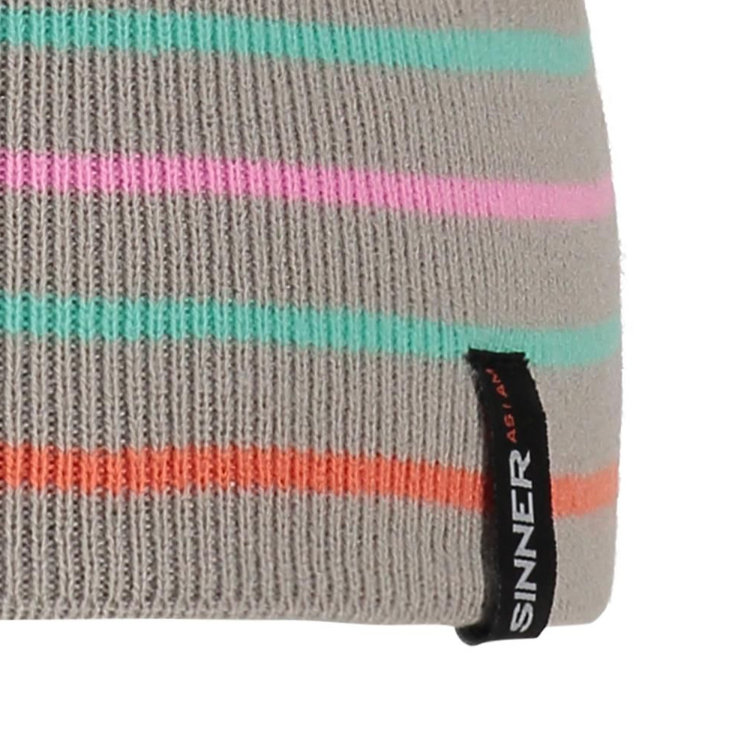 Deze leuke Sinner Country kinder muts is uitgevoerd in grijs-beige met roze en groene details. Deze unisex beanie zit lekker en is gemaakt van zachte, warme 100% Acrylwol. Het materiaal is fijn gebreid en het leuke streep-design maakt hem zeker populair.