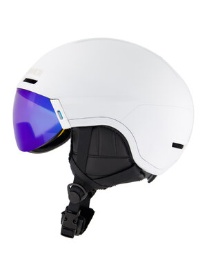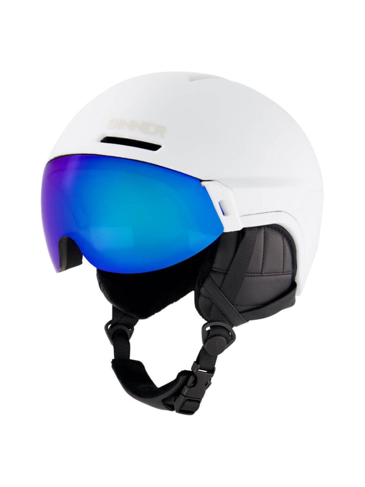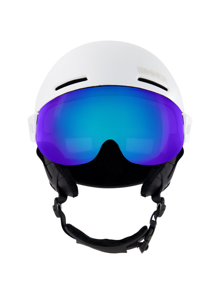 Deze witte vizierhelm is uitgevoerd met het beroemde, spiegelend Sinner Blue Revo kleurvizier (Cat. 2) dat optimaal zicht biedt bij bewolkt tot licht zonnig weer. De spiegelcoating op het vizier maakt de uitstraling niet alleen cool, ook vizier blokt het alle UV én infrarode straling wat een belangrijke bijdrage levert aan de zon-bescherming, hoe fel de zon ook is. Het vizier zorgt voor panoramisch zicht en voorkomt het op-en-af-gedoe met een losse skibril. Deze skihelm is ook v.v. een OTG (Over The Glasses) vizier, wat erg fijn is voor brildragers die hun bril op sterkte eronder willen dragen.