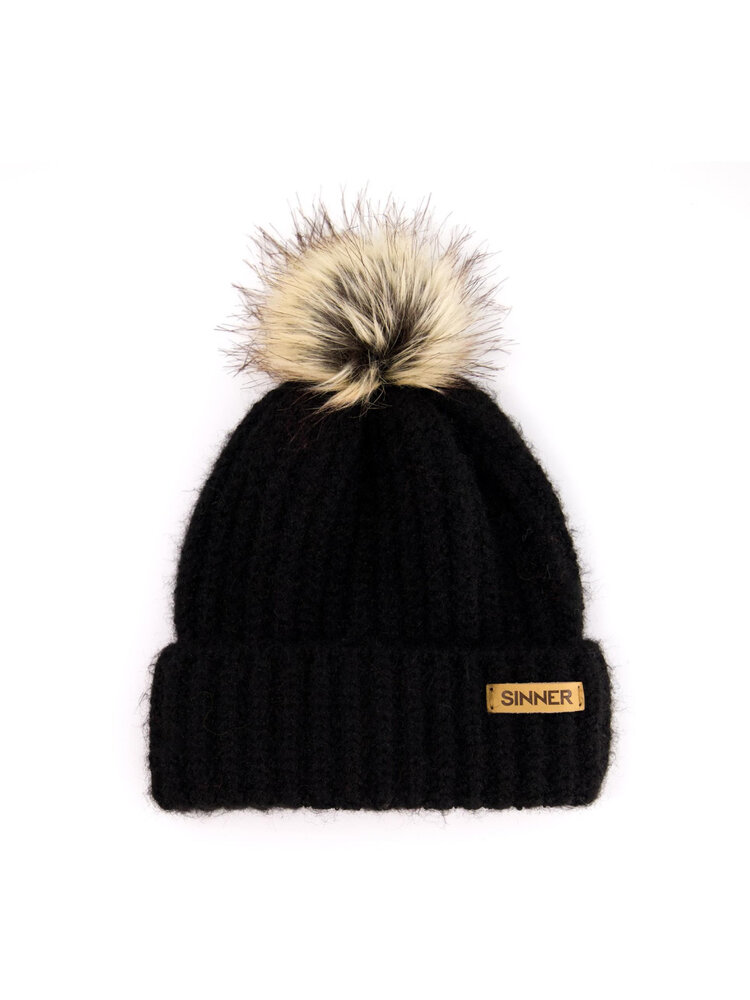 Heerlijk warm en voorzien van originele, haarachtige Pom Pom is deze met de hand gebreide Sinner Mossy 2024 muts in zwarte versie. Beanie van zacht Acryl / Polyester. Voorzien van lederen Sinner branding.