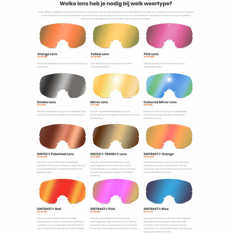 De lens van een skibril bepaalt uw zicht en de mate van bescherming van uw ogen die de lens biedt tegen de schadelijke kant van zonlicht (UV-400 bescherming). Deze photochromic Sintrast Trans+ lens zorgt voor een helder, contrastrijk beeld en filtert alle reflectie er keurig uit. Ideaal bij bewolkt tot licht zonnig weer (Cat.1-3) en blokt 100% UV én Infra-Rood straling.