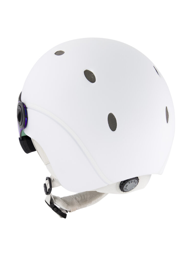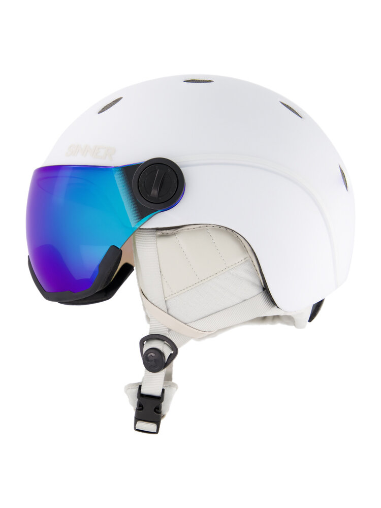 Deze witte skihelm is uitgevoerd met het beroemde, spiegelend Sinner kleurvizier (Cat. 2) dat optimaal zicht biedt bij bewolkt en sneeuwig tot licht zonnig weer. De spiegelcoating op het vizier maakt de uitstraling niet alleen cool, ook blokt het alle UV én infrarode straling wat een belangrijke bijdrage levert aan de zon-bescherming, hoe fel de zon ook is. Het vizier zorgt voor panoramisch zicht en voorkomt op-en-af-gedoe met een losse skibril.