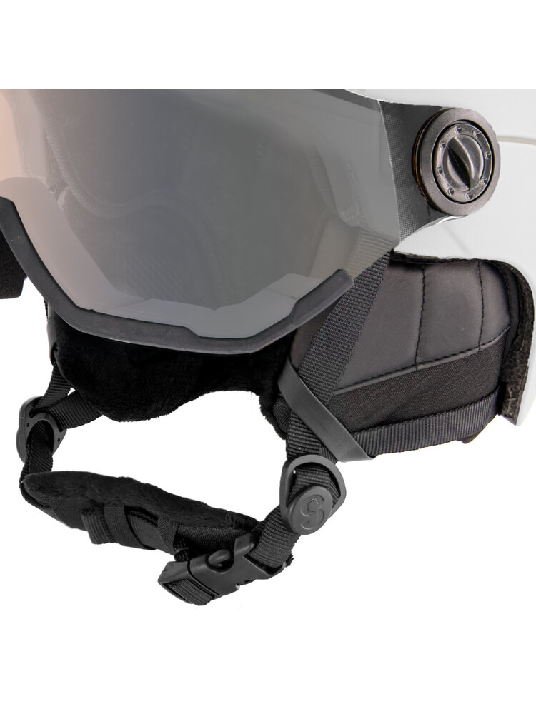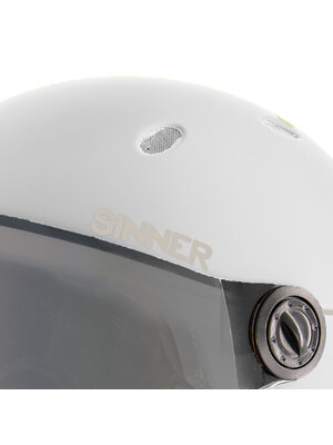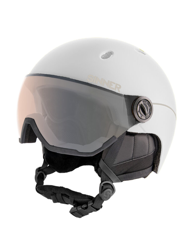 Deze witte skihelm is uitgevoerd met het beroemde, meekleurende Sinner Trans+ Photochromic vizier (Cat. 1-3) dat optimaal zicht biedt bij de meest voorkomende weersomstandigheden van donker bewolkt en sneeuwig tot zonnig weer. Wisselen van vizier als het weer omslaat is dus voorgoed verleden tijd. Die coating op het vizier maakt de uitstraling niet alleen cool, ook blokt het alle UV straling wat een belangrijke bijdrage levert aan de zon-bescherming, hoe fel de zon ook is. Het vizier zorgt voor panoramisch zicht en voorkomt op-en-af-gedoe met een losse skibril.