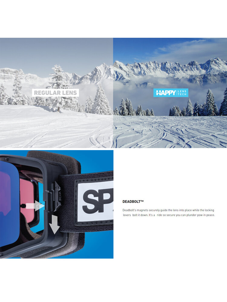 Happy™ Lens Technology van Spy+ is ontworpen om kleuren te versterken en veranderingen in het terrein te benadrukken, terwijl het humeur en de alertheid worden verhoogd voor een game-changing sneeuw ervaring. Deze spiegellenzen dekken nagenoeg ieder weertype af wat de bril geschikt maakt van donker, sneeuwerig weer tot volle zon. De dubbel-laags lenstechniek zorgt ervoor dat de lens niet bevriest en nauwelijks kan beslaan. De spiegelcoating op deze lens ziet er cool uit en belangrijker nog, hij blokt alle schadelijke UV. Het magnetische wisselsysteem laat u binnen enkele seconden wisselen van lichte naar donkere lens en terug als het weer omslaat.