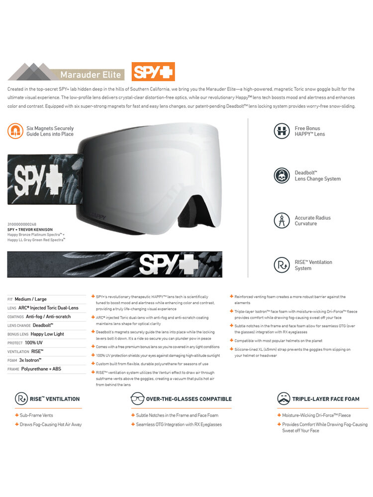Of je nou een skiër bent of een snowboarder, dit is een zeer interessante skibril. Los van of u het design mooi vindt of niet qis er een hele indrukwekkende lijst met specificaties bij deze Spy + Marauder ski- en snowboardbril met Toric design en onzichtbaar frame. Dit model heeft een drievoudig foam (hypo-allergeen) waarmee hij zeer comfortabel aansluit op uw gezicht. Het beslaan van het onbreekbare 'glas', dankzij de dubbele lens met Anti-Fog coating en geïntegreerde frame-ventilatie, voorgoed verleden tijd. De bescherming tegen UV-A, UV-B en UV-C is optimaal, mede dankzij de spiegelcoating op de lens. Kortom... deze bril mag zich meten met de top-skibrillen in de branche.