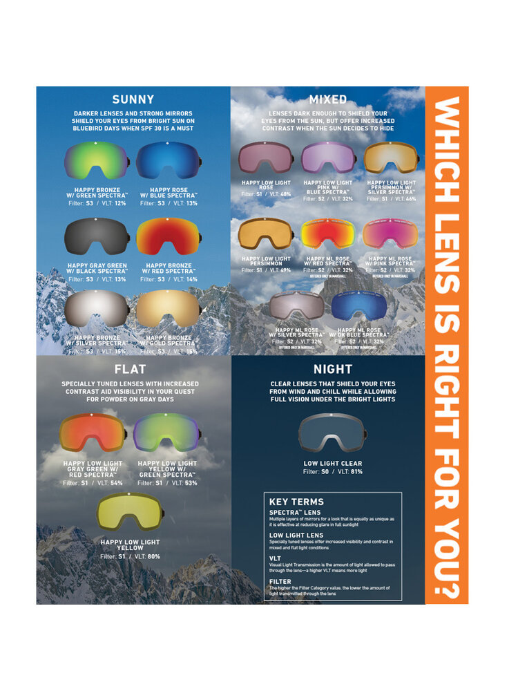 Happy™ Lens Technology van Spy+ is ontworpen om kleuren te versterken en veranderingen in het terrein te benadrukken, terwijl het humeur en de alertheid worden verhoogd voor een game-changing sneeuw ervaring. Met deze categorie 3 spiegellens bent u verzekerd van optimaal zicht bij donker bewolkt tot lekker zonnig weer. Deze lenzen beschermen 100% tegen schadelijke UV en dankzij de spiegelcoating bent u ook beschermd tegen Infrarood straling. De dubbel-laags lenstechniek zorgt ervoor dat de lens niet bevriest en nauwelijks kan beslaan.