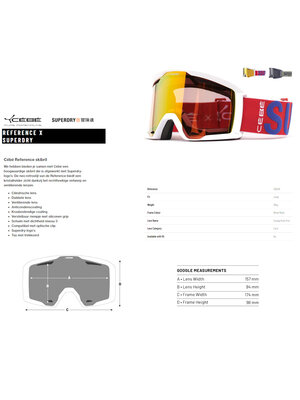 De lens van deze SuperDry CéBé Reference X skibrillen is Cilindrisch gevormd dus v.v. een horizontale bolling. Hij wordt geleverd met een spiegellens (S2) waardoor optimaal zicht ontstaat van bewolkt tot licht zonnig weer. De dubbelwandige lenzen zijn Anti-Fog en Anti-Scratch bewerkt en de frame- en lensventilatie zijn prima op orde. Het flexibele comfortframe en de drievoudige, antibacteriële foamlaag waarmee de skibril het gezicht raakt, zorgen voor een zeer prettig draagcomfort. Zoals bij alle CéBé goggles is het handig dat de band silicone anti-slip matariaal heeft dat voorkomt dat de skibril van uw helm af glijdt.
